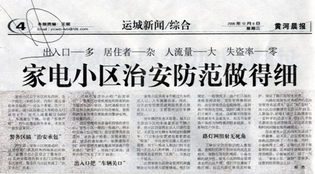 家電小區(qū)位于市區(qū)河?xùn)|西街,是一個(gè)商住一體的小區(qū),內(nèi)有廣廈五金機(jī)電市場(chǎng)商戶一百五十多家、住戶三百余家。該小區(qū)僅能過(guò)大車的出入口就有4個(gè),每天流量超過(guò)5000人,車流量近千輛。盡管“形勢(shì)嚴(yán)峻”,但小區(qū)建起兩年多來(lái),未發(fā)生一起失盜案件。